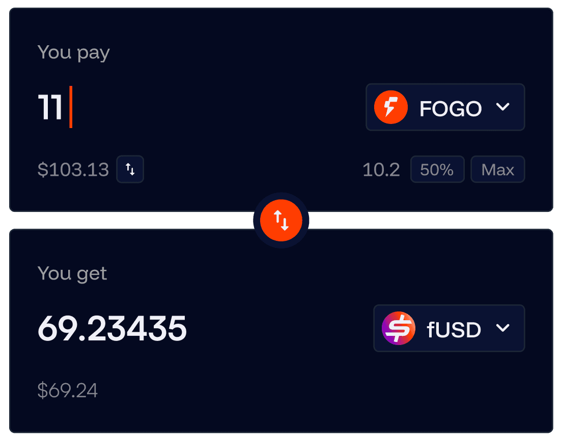 Interface to decentralized exchange protocols. Enter an amount, review the quoted rate (including fees and slippage), then execute directly from your wallet. Fogo does not custody assets or execute trades. Transaction costs reduced where supported by the network.